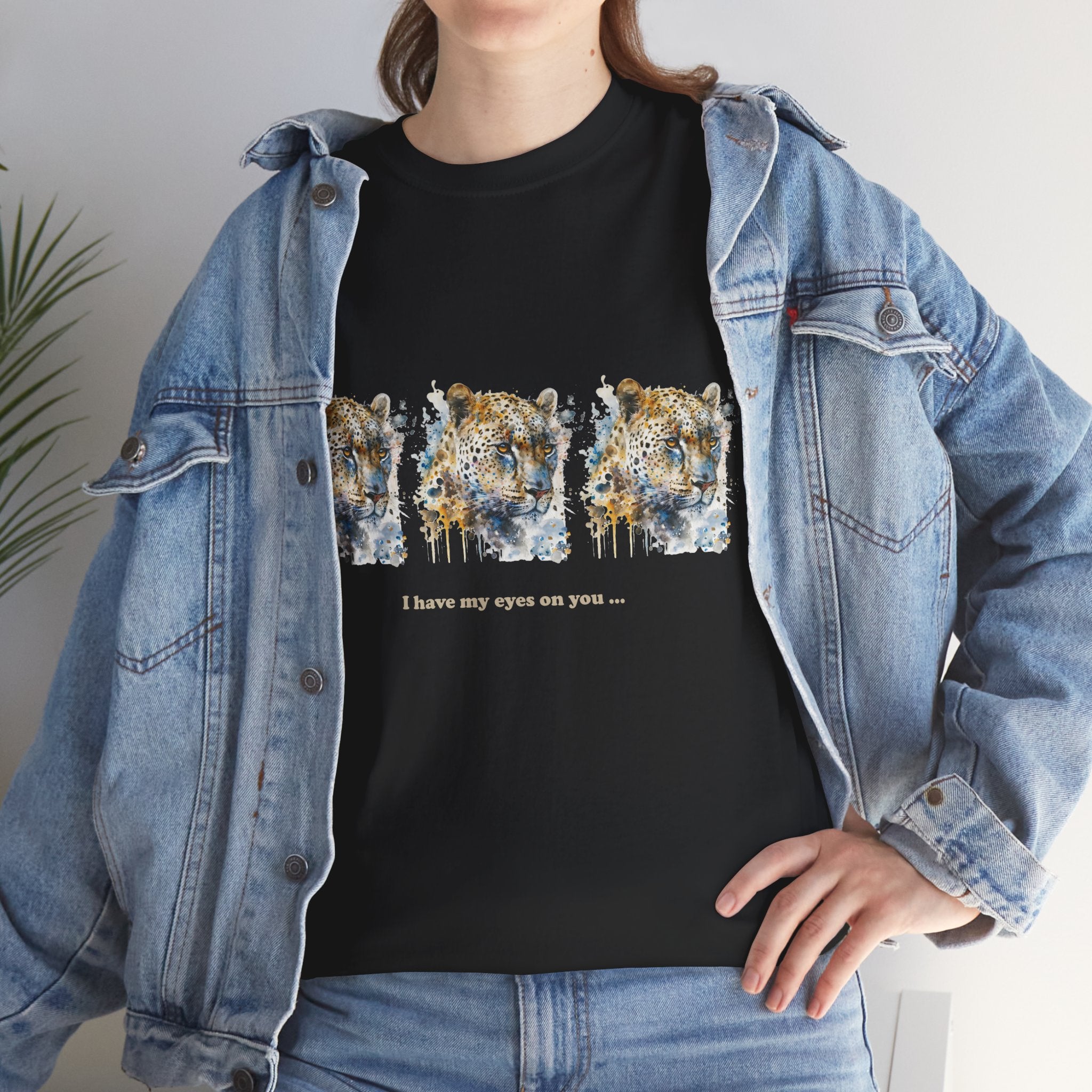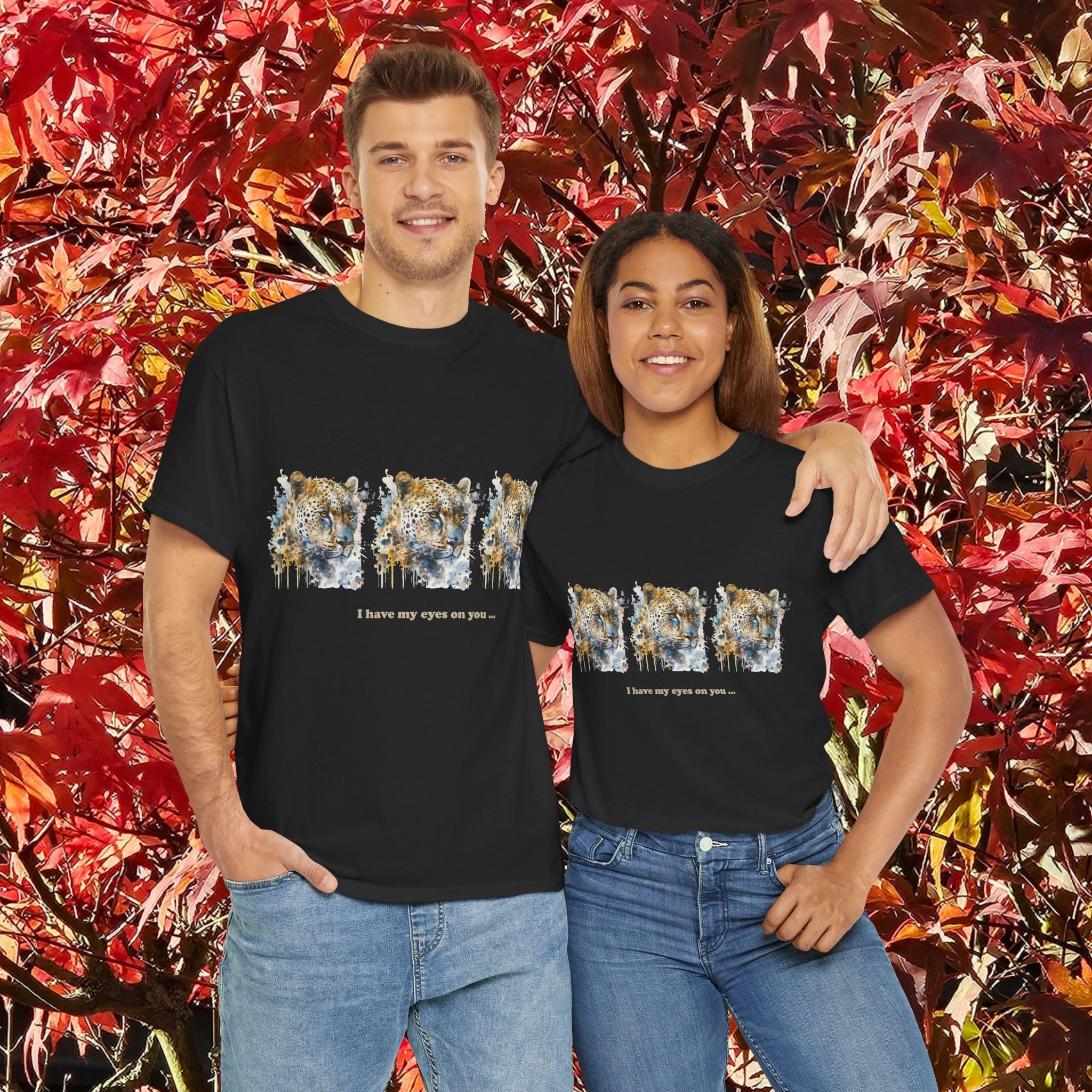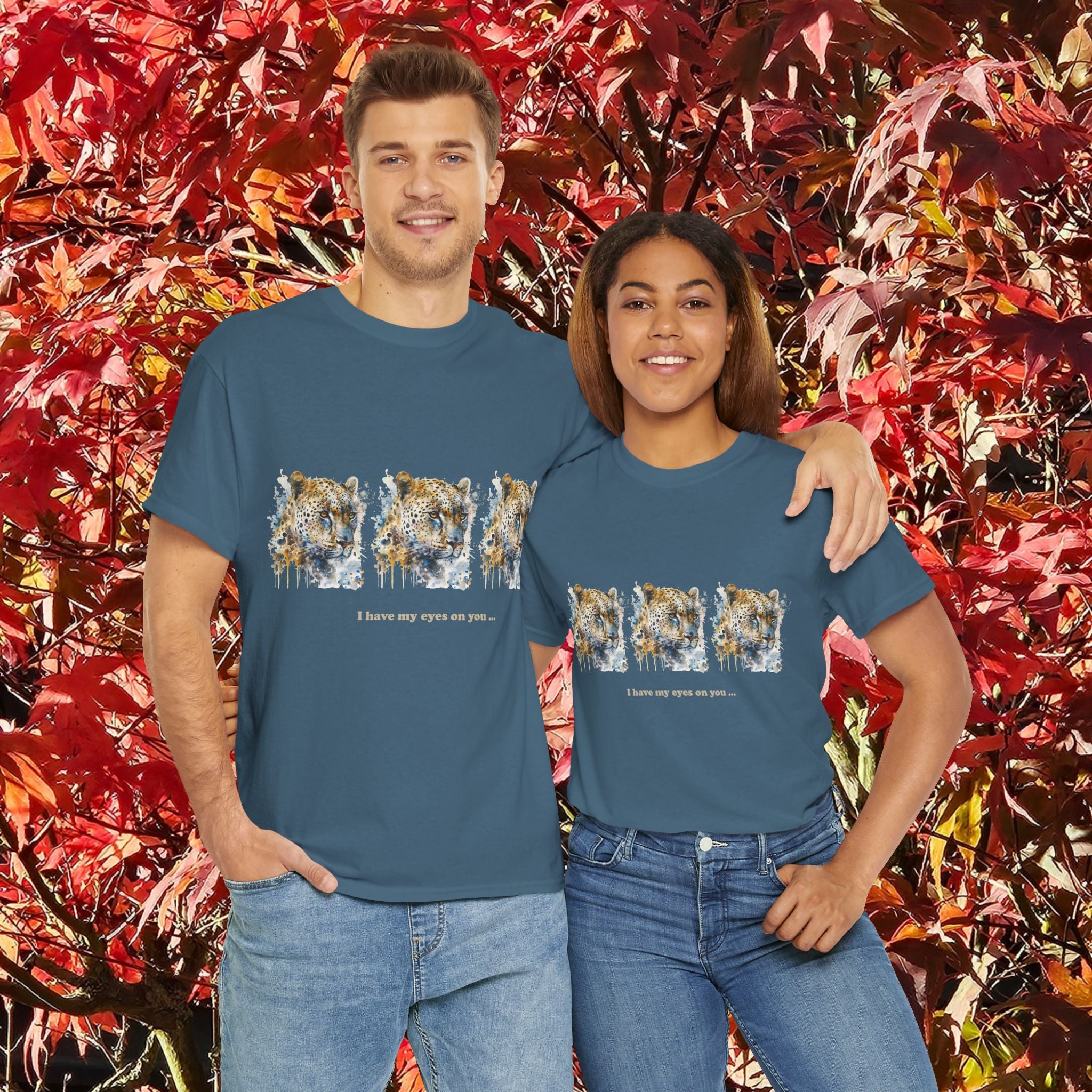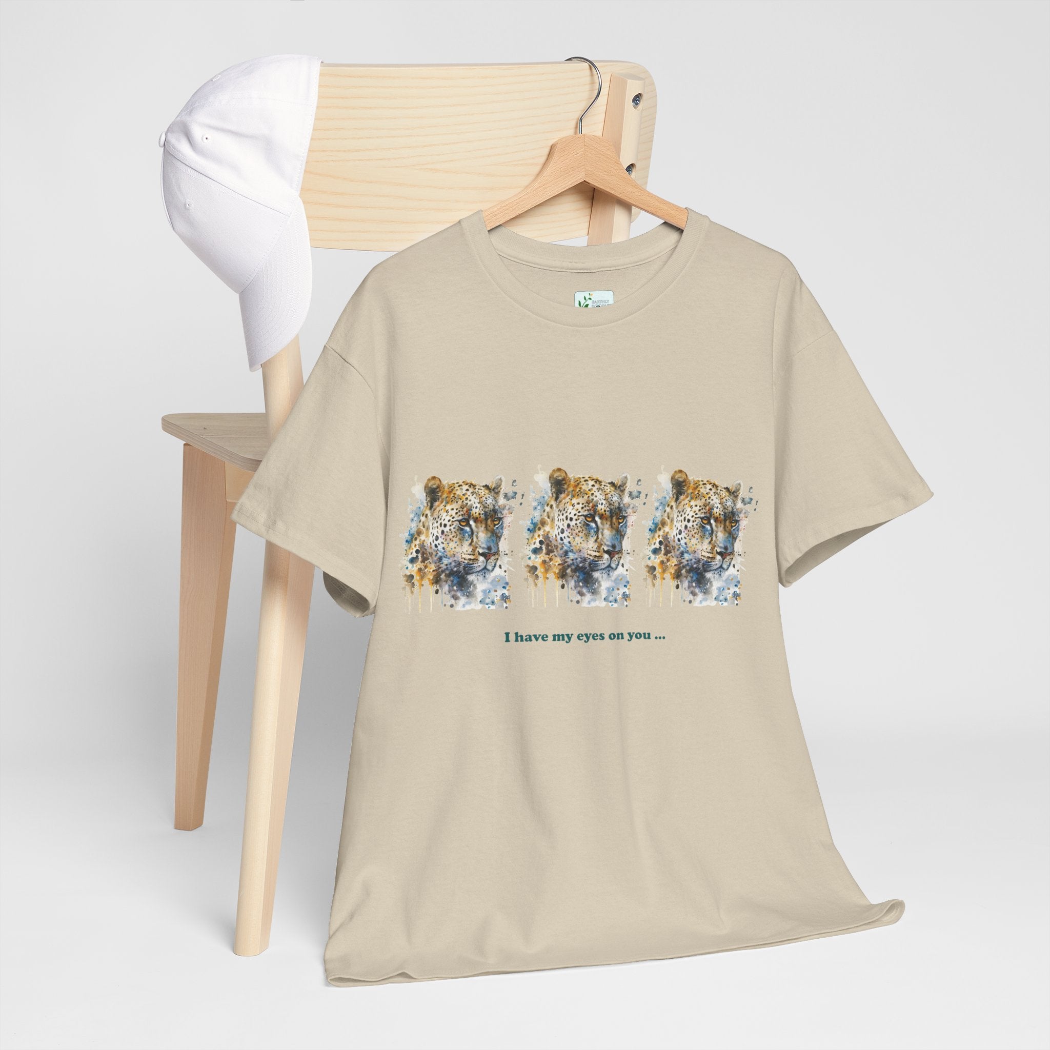 A classic and comfortable tee featuring a trio of stunning leopards with the playful caption 'I have my eyes on you' ... you looking out for your younger family members, or on someone you admire maybe! Perfect for animal lovers and those who appreciate unique designs. This T-shirt is suitable for casual wear or can be dressed up for a semi-formal look. Ideal for gifting on birthdays, wildlife enthusiasts, and animal-themed events ... and for those with a playful sense of humour!