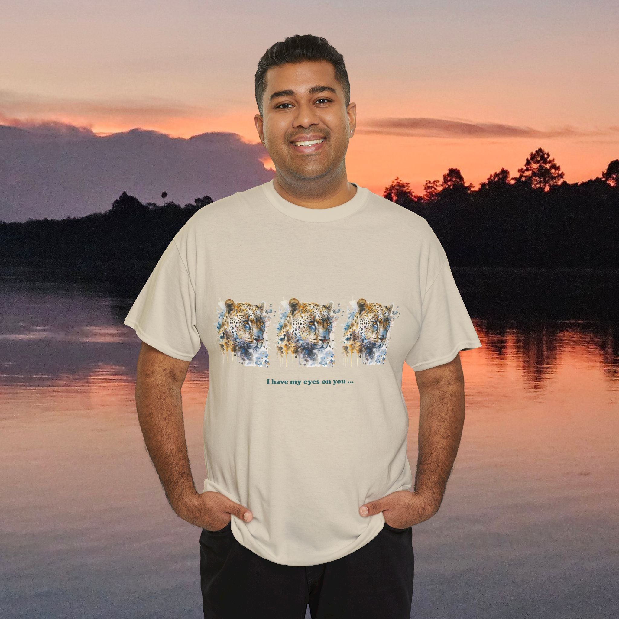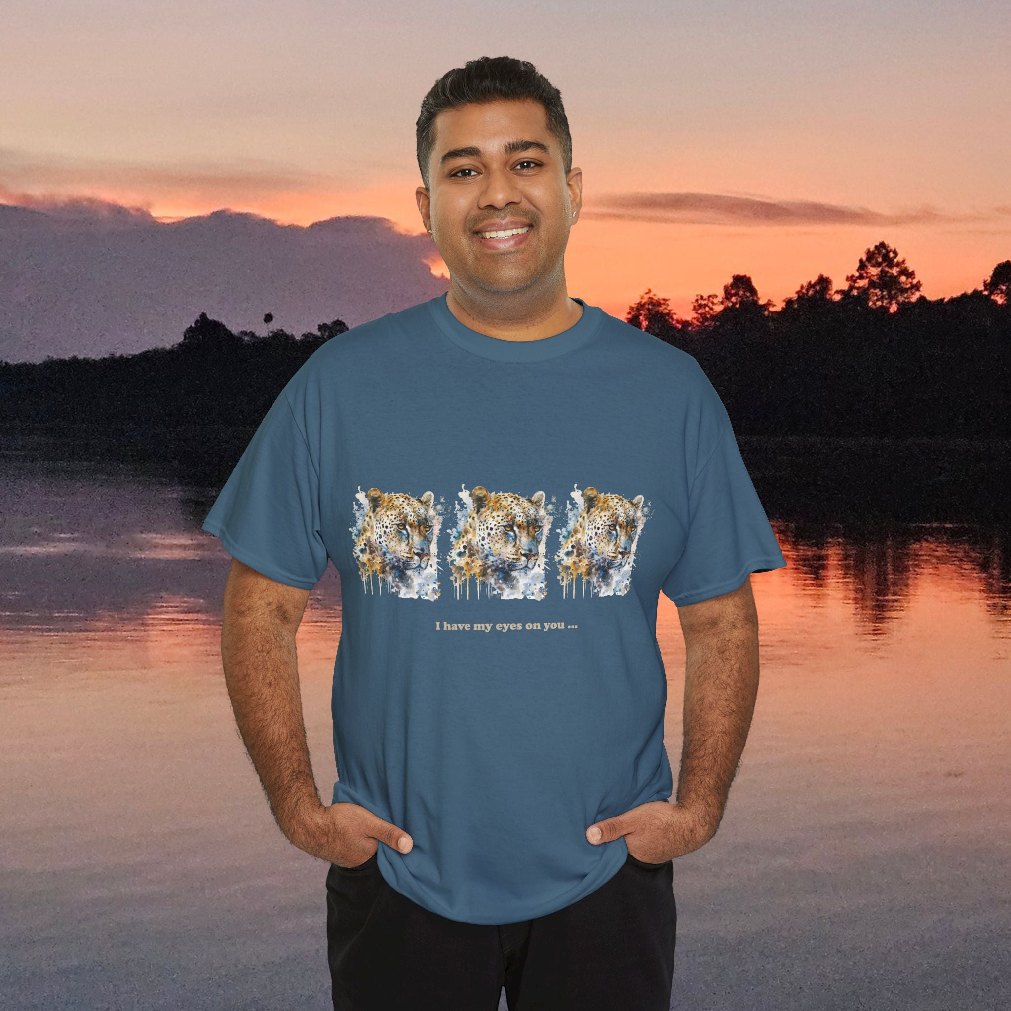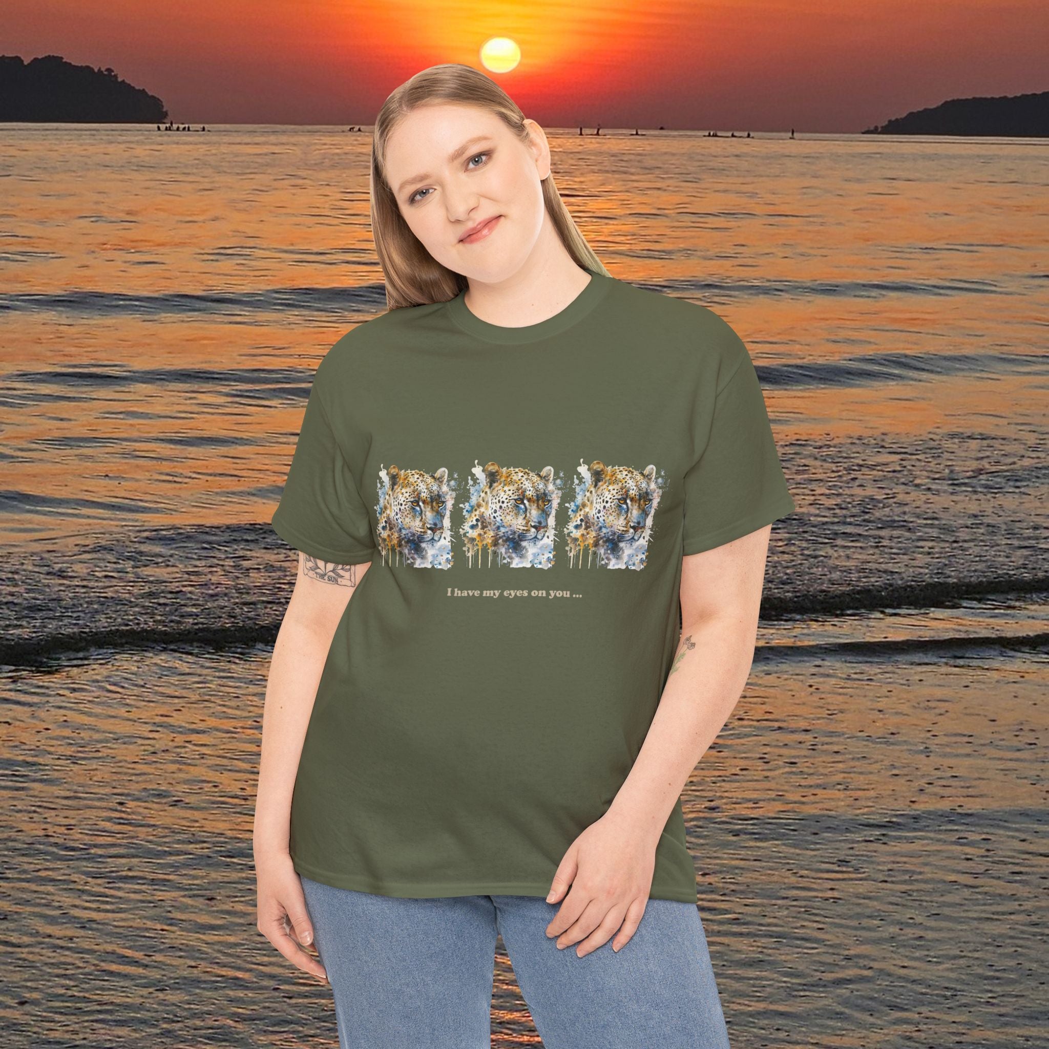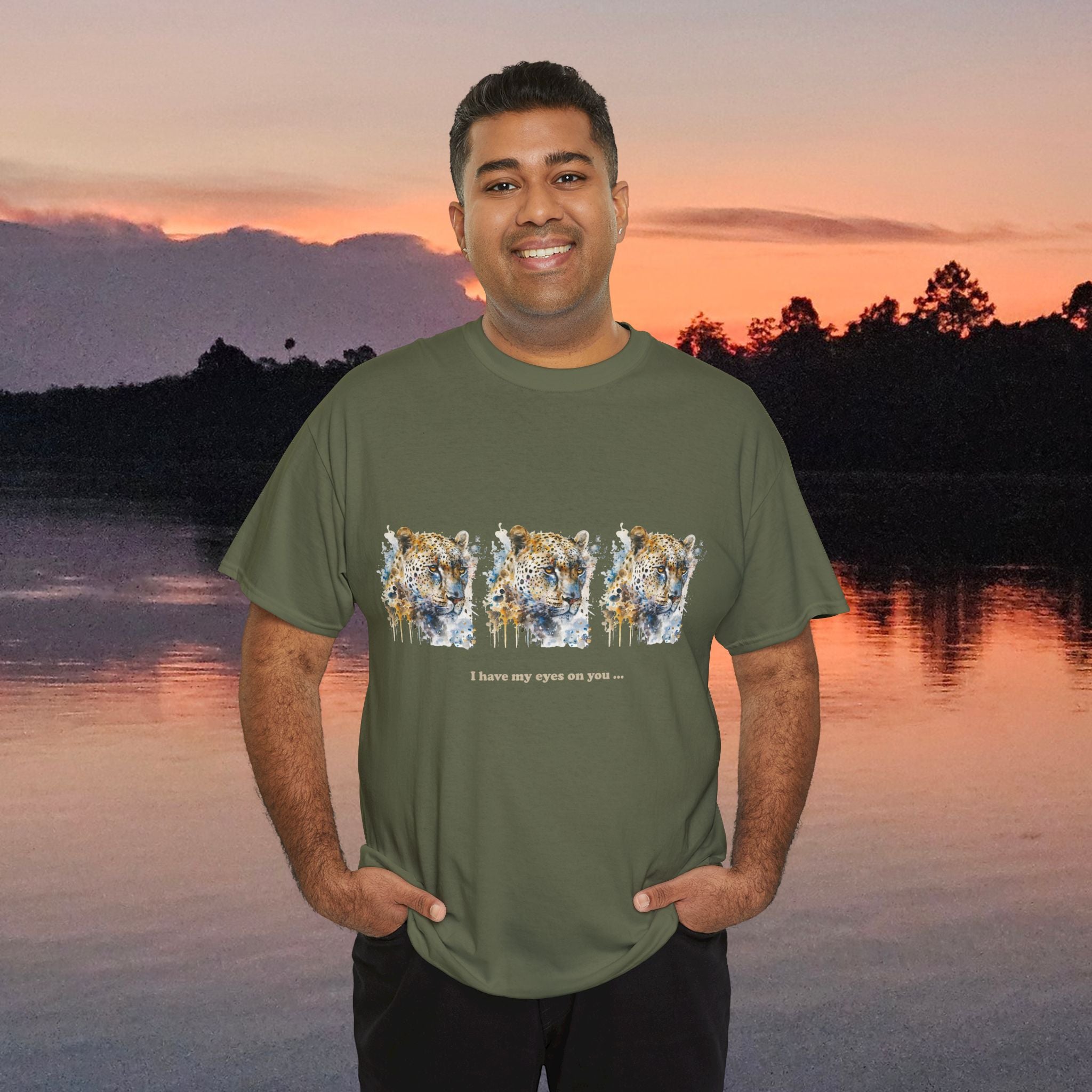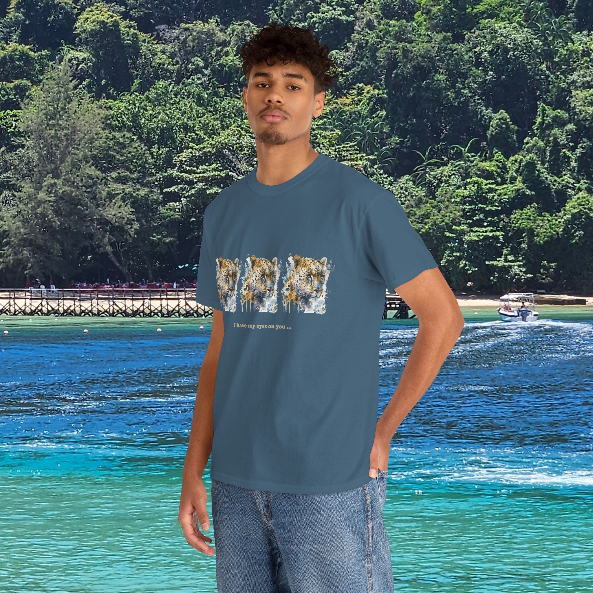 A classic and comfortable tee featuring a trio of stunning leopards with the playful caption 'I have my eyes on you' ... you looking out for your younger family members, or on someone you admire maybe! Perfect for animal lovers and those who appreciate unique designs. This T-shirt is suitable for casual wear or can be dressed up for a semi-formal look. Ideal for gifting on birthdays, wildlife enthusiasts, and animal-themed events ... and for those with a playful sense of humour!