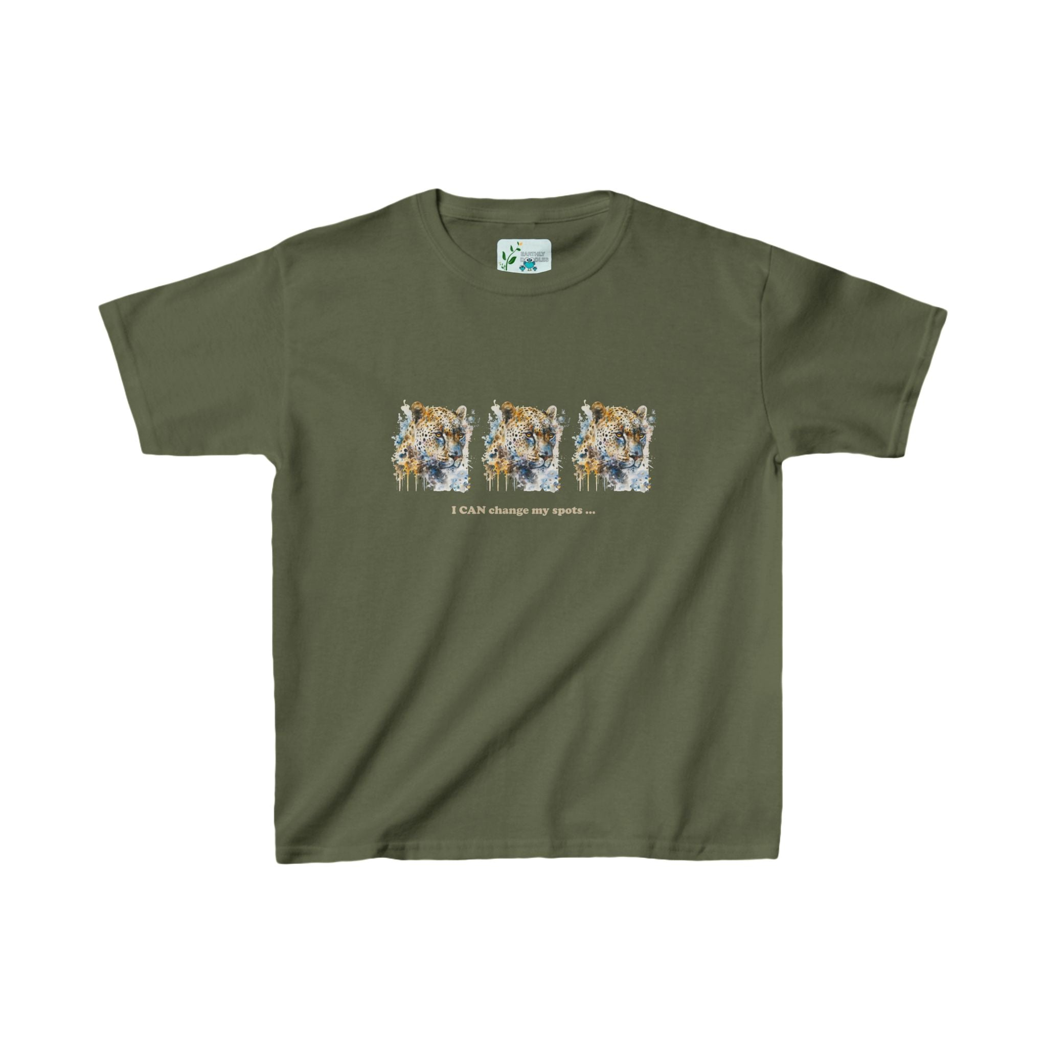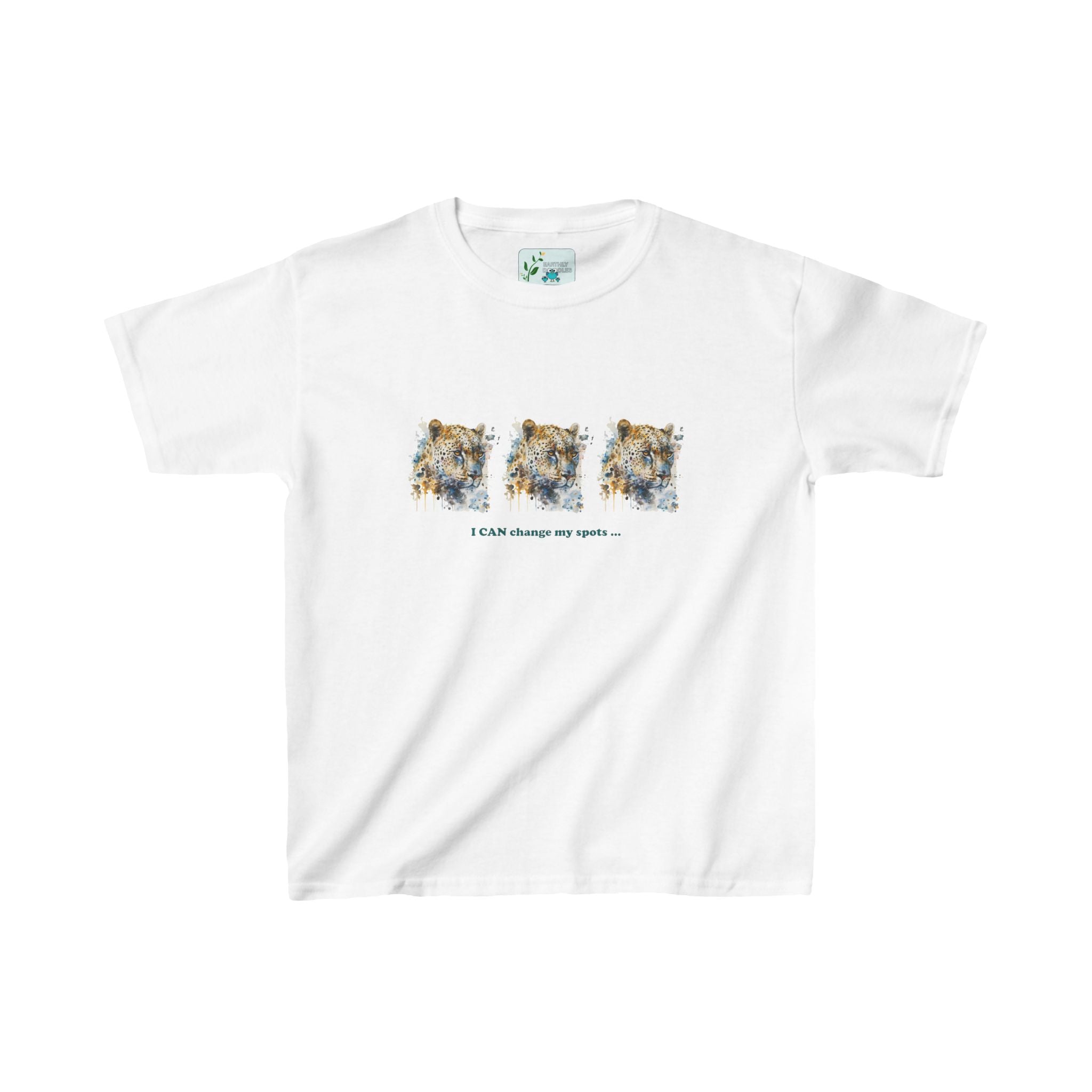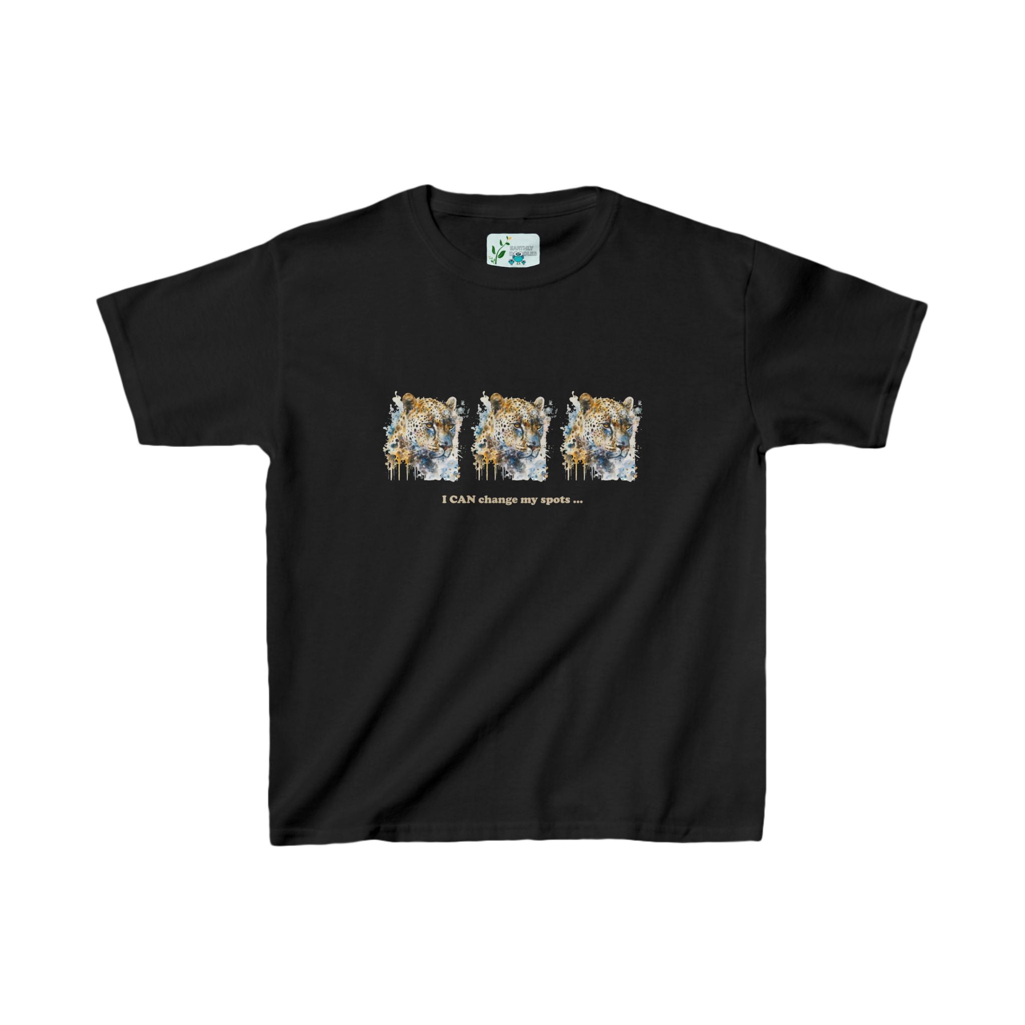 This child's T-shirt features a playful design of 3 stunning leopards with the message that they can change their spots, contrary to the old saying, and we can work on who we are. The tee is made with 100% US cotton, providing a soft touch and versatile for any season. The classic fit and crew neckline offer a timeless style perfect for daily wear.