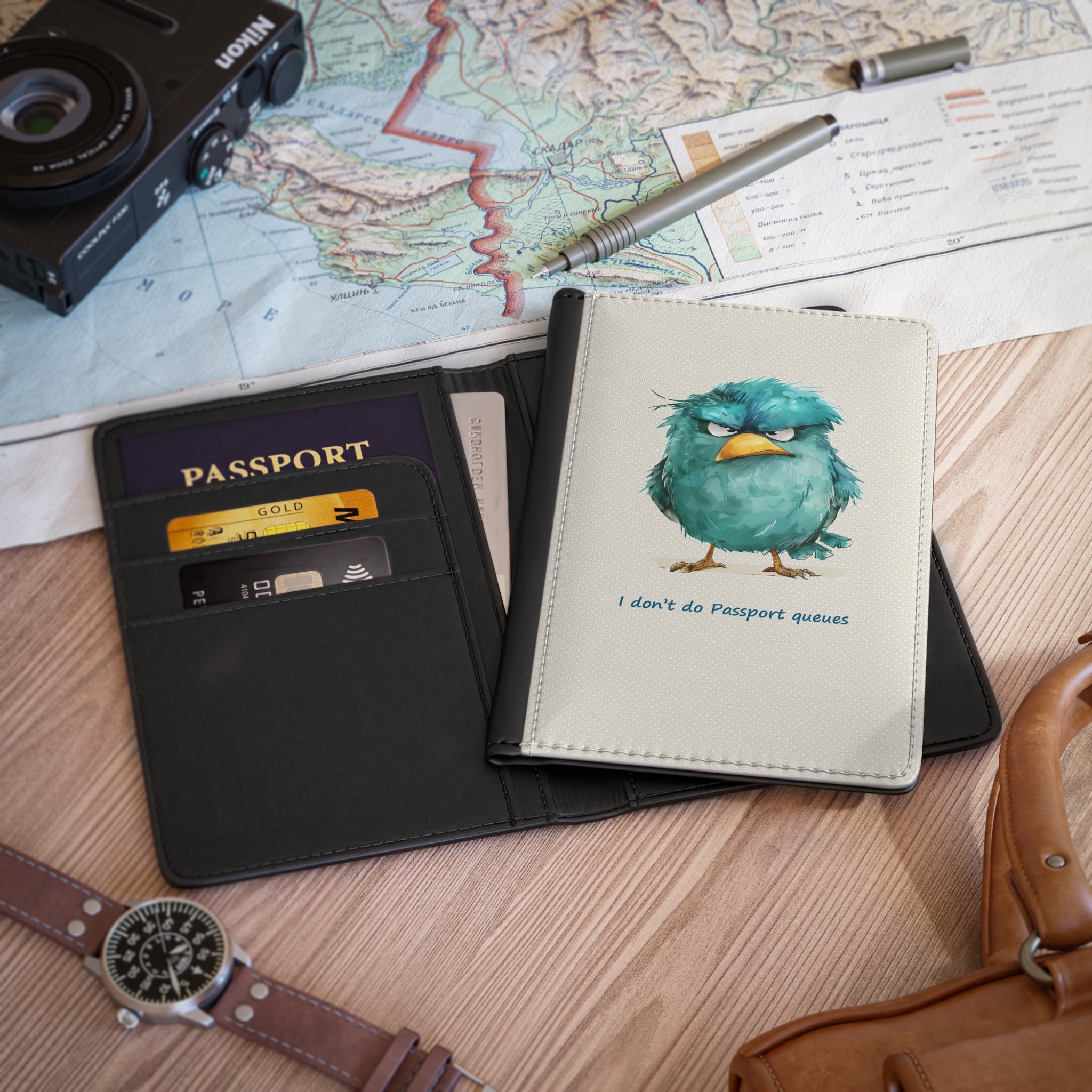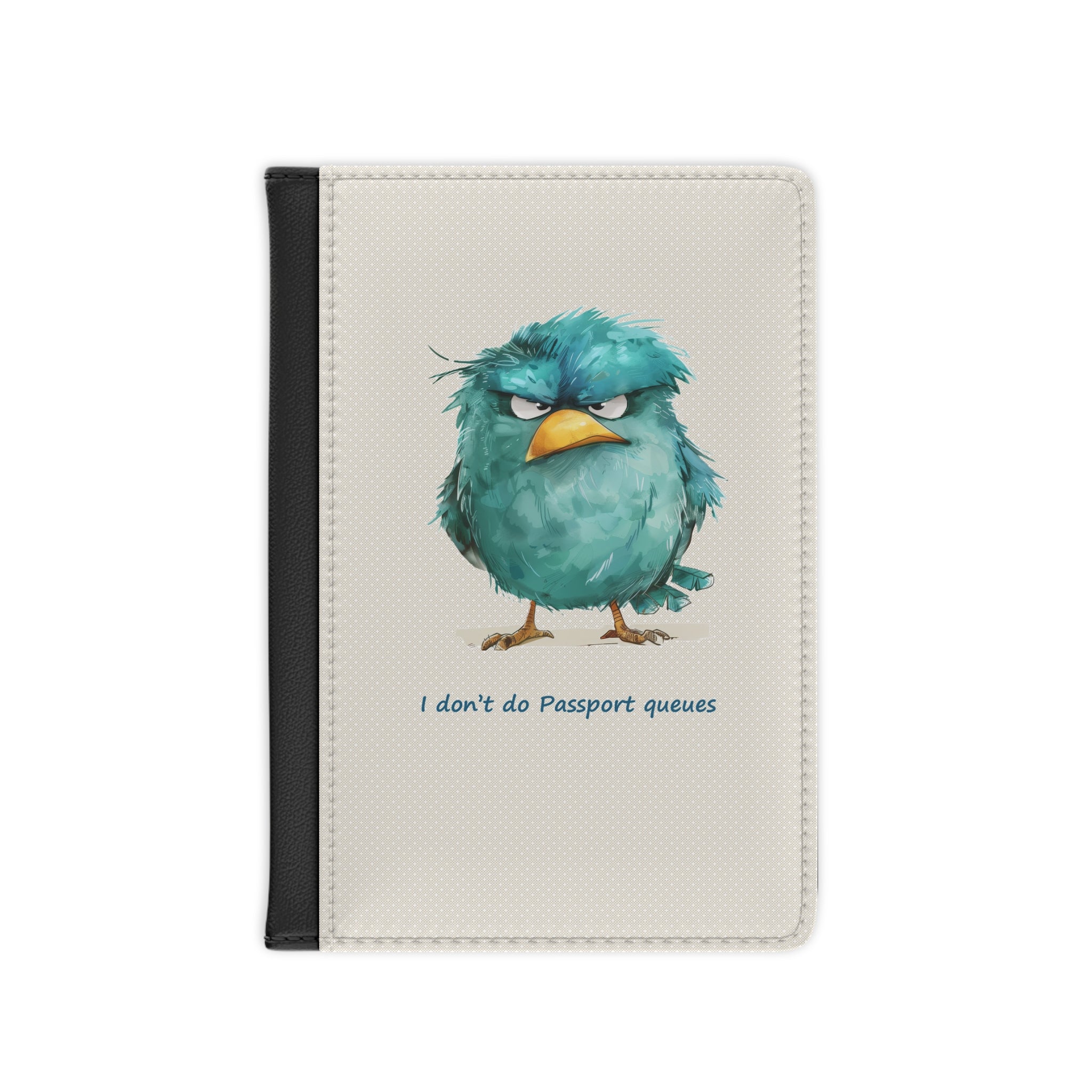 A whimsical Passport Cover featuring a Turquoise Grumpy Bird design that adds a fun and playful touch to your travel accessories. Perfect for those who enjoy unique and quirky items, this passport cover is ideal for adding some personality to your journeys. Relevant for vacationers, frequent travelers, and those with a sense of humour! Great for gifting during holidays like Christmas, birthdays, and graduations.