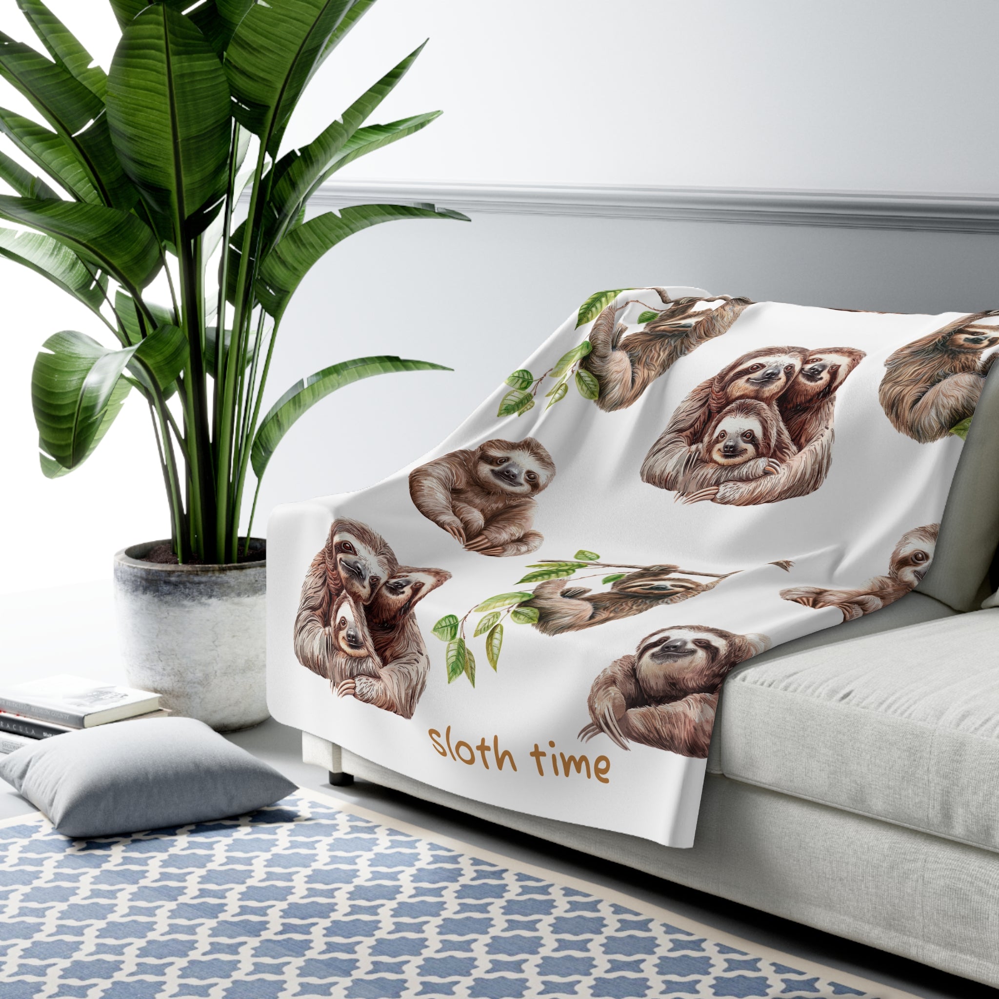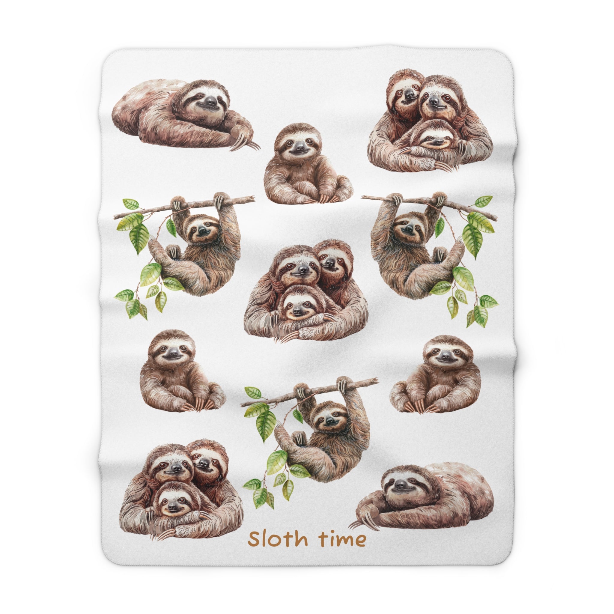 Stay cosy and warm with this Sherpa Fleece Blanket featuring a Sloth Family snuggling, relaxing and playing. It comes in two sizes, each with a slight variation in design. Perfect for chilly nights or lazy days on the couch, this blanket brings a relaxed and adorable vibe to your home ... be sloth-like! Ideal for animal lovers and those who appreciate cute and heartwarming designs, this blanket is great for gifting on birthdays, holidays, or as a thoughtful gesture for a loved one.