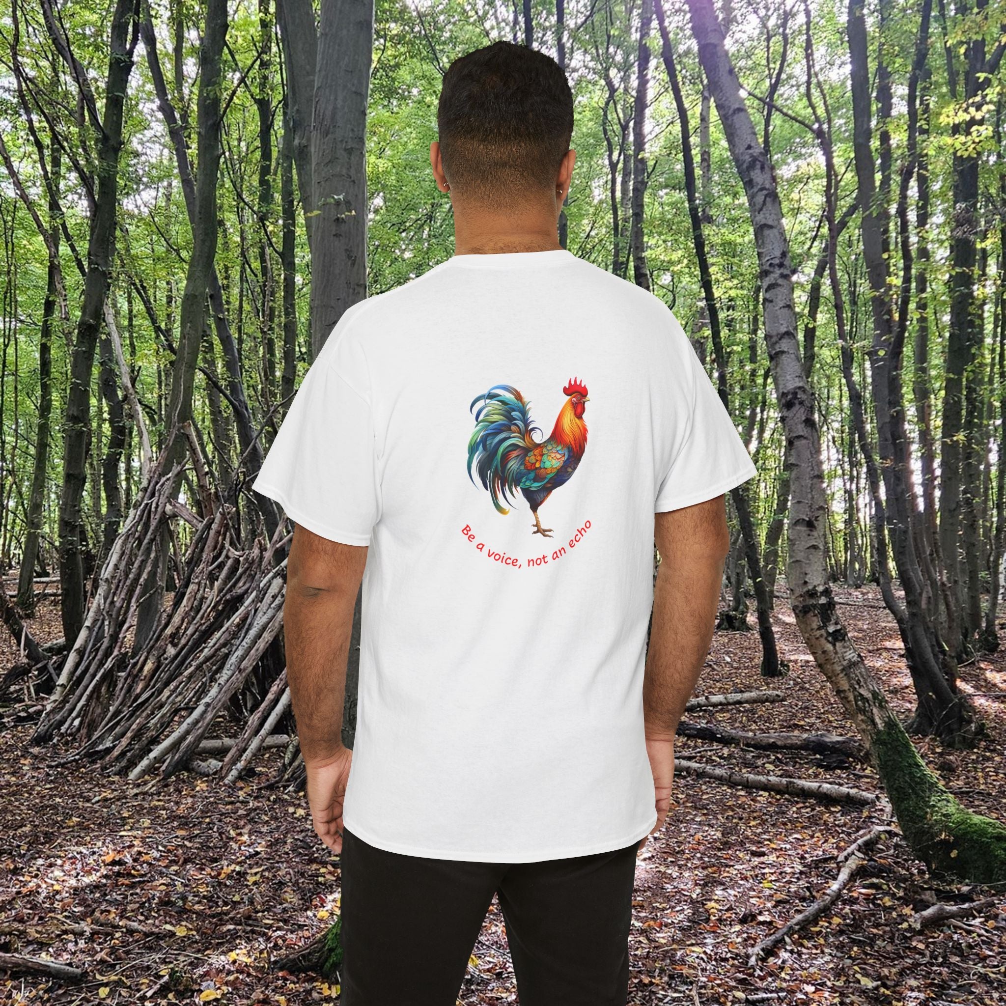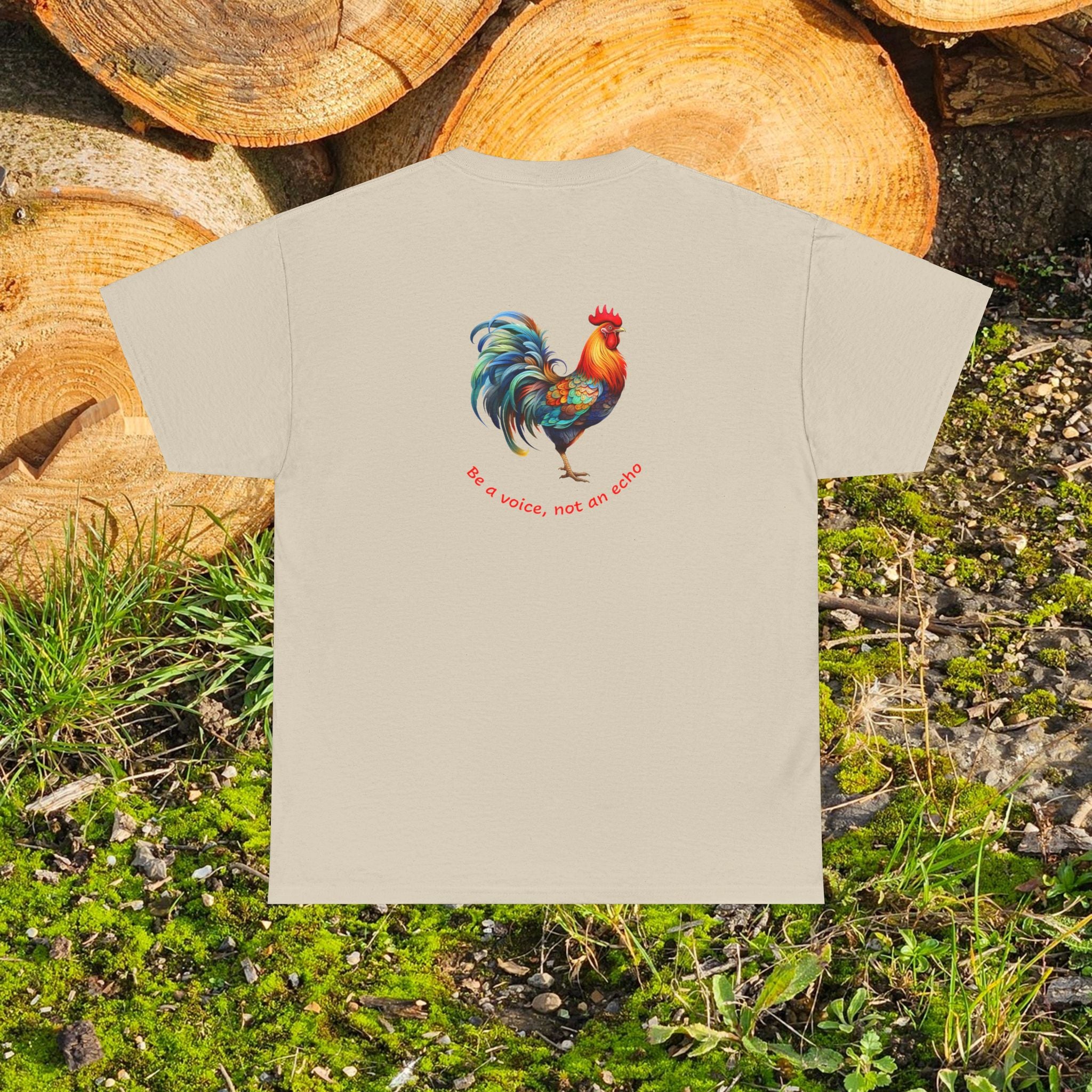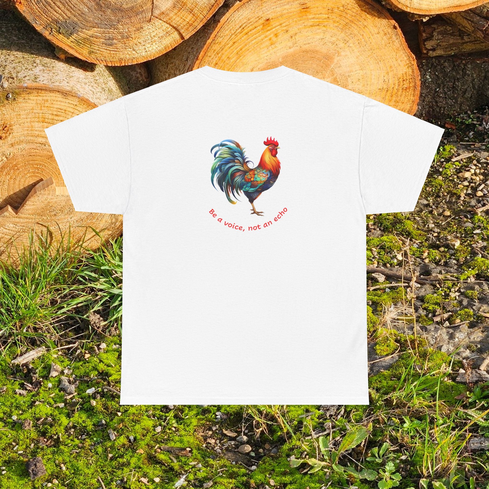 A unisex heavy cotton tee featuring a rooster front and back, accompanied by the message 'Be a voice, not an echo' on the back ... leaving your message behind! This tee exudes a bold and empowering vibe, perfect for those who want to make a statement with their fashion choices, and reminding us all to speak up. Ideal for those who prioritize comfort and style in their everyday wardrobe.
