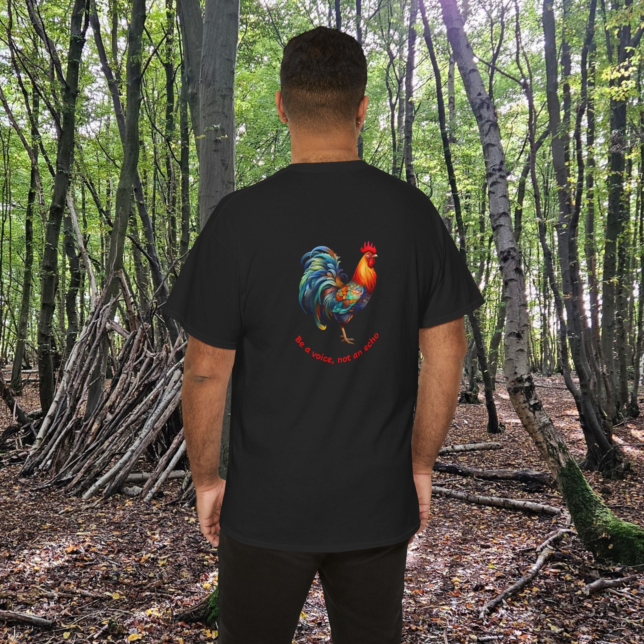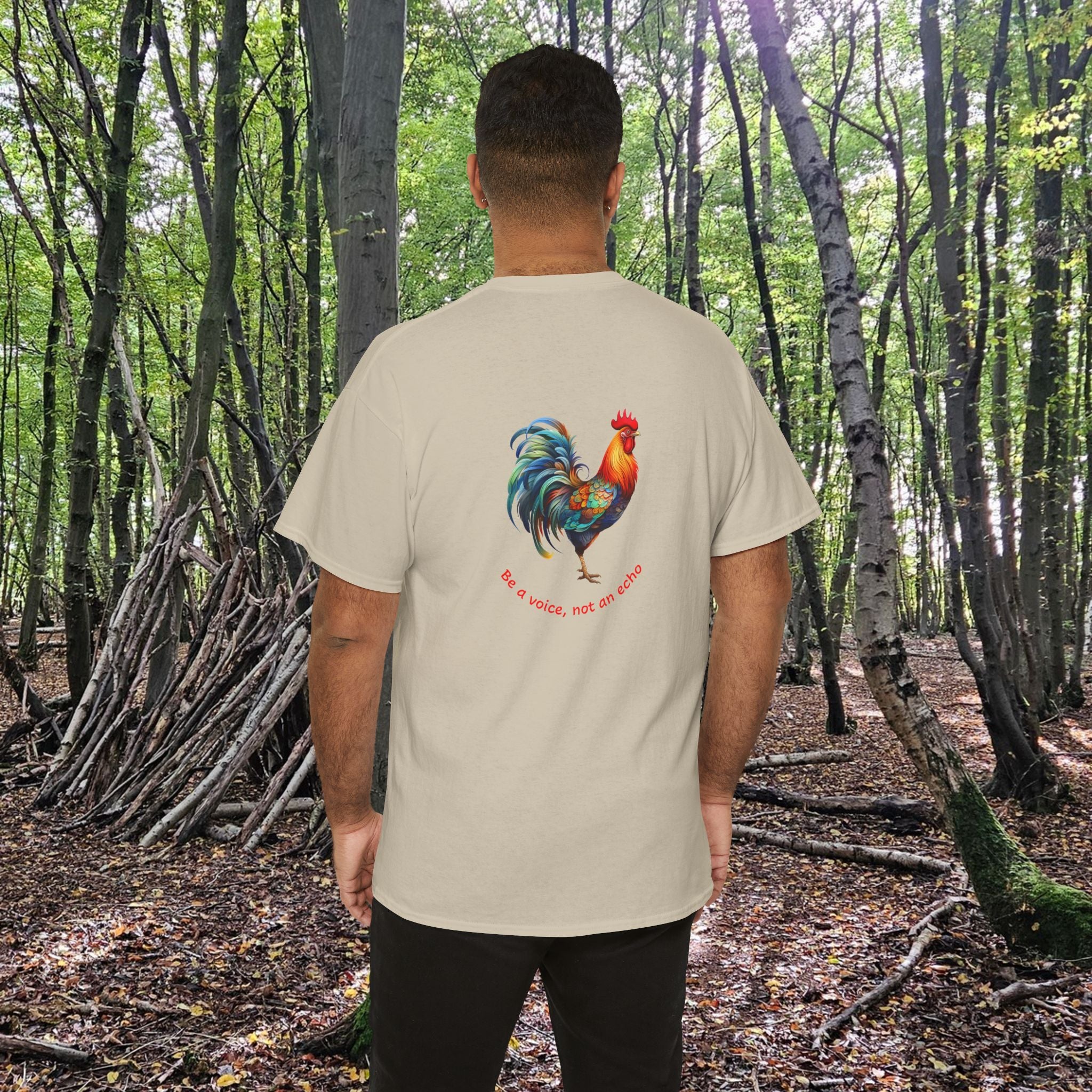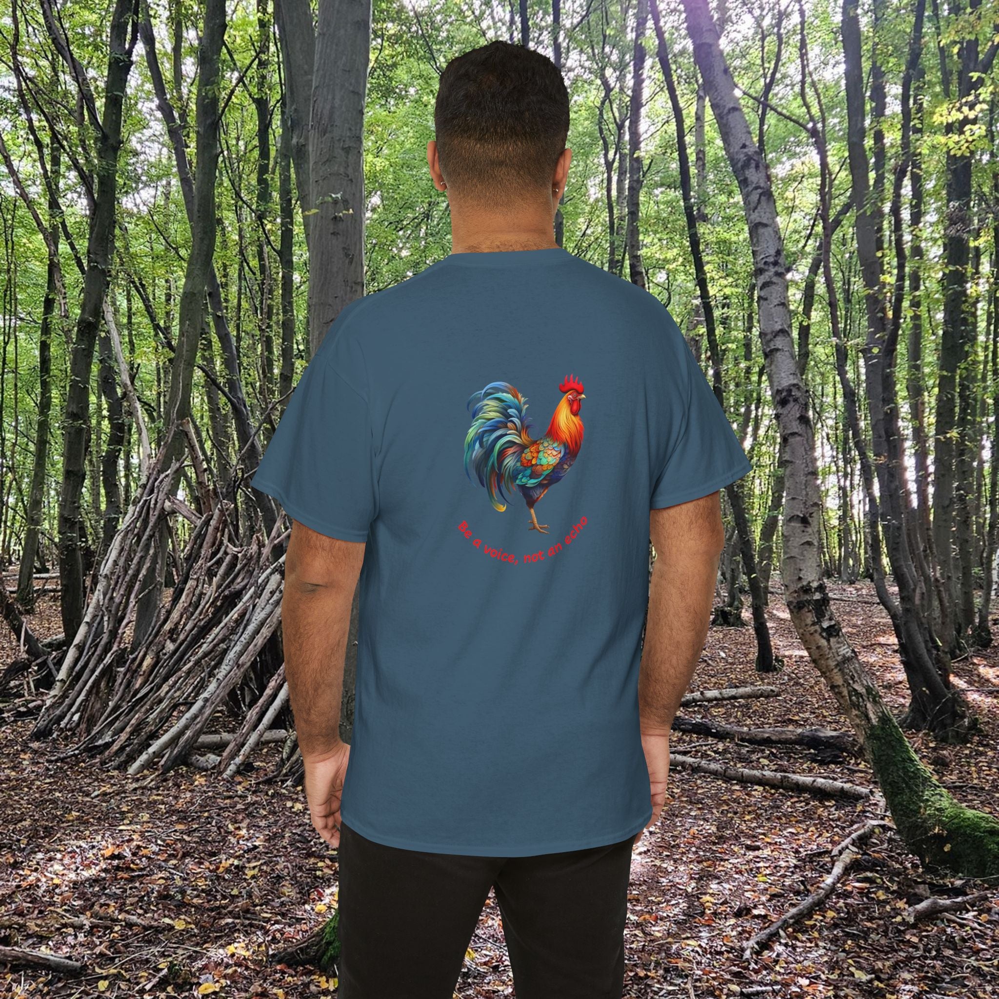 A unisex heavy cotton tee featuring a rooster front and back, accompanied by the message 'Be a voice, not an echo' on the back ... leaving your message behind! This tee exudes a bold and empowering vibe, perfect for those who want to make a statement with their fashion choices, and reminding us all to speak up. Ideal for those who prioritize comfort and style in their everyday wardrobe.