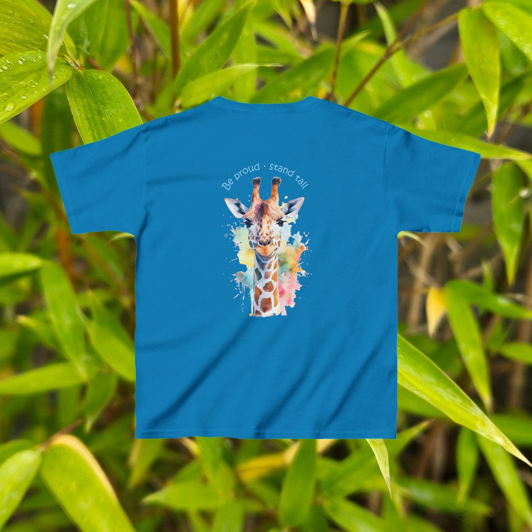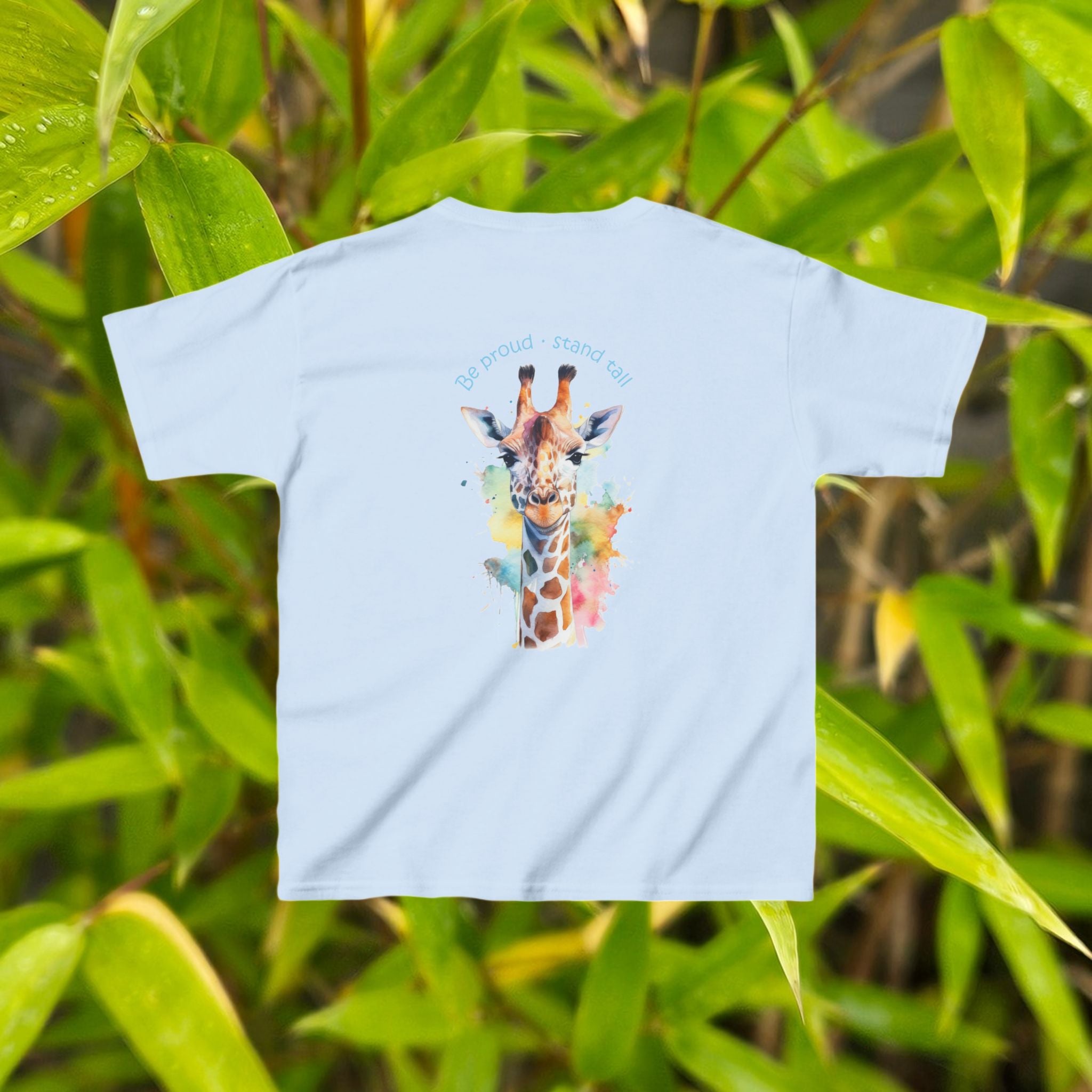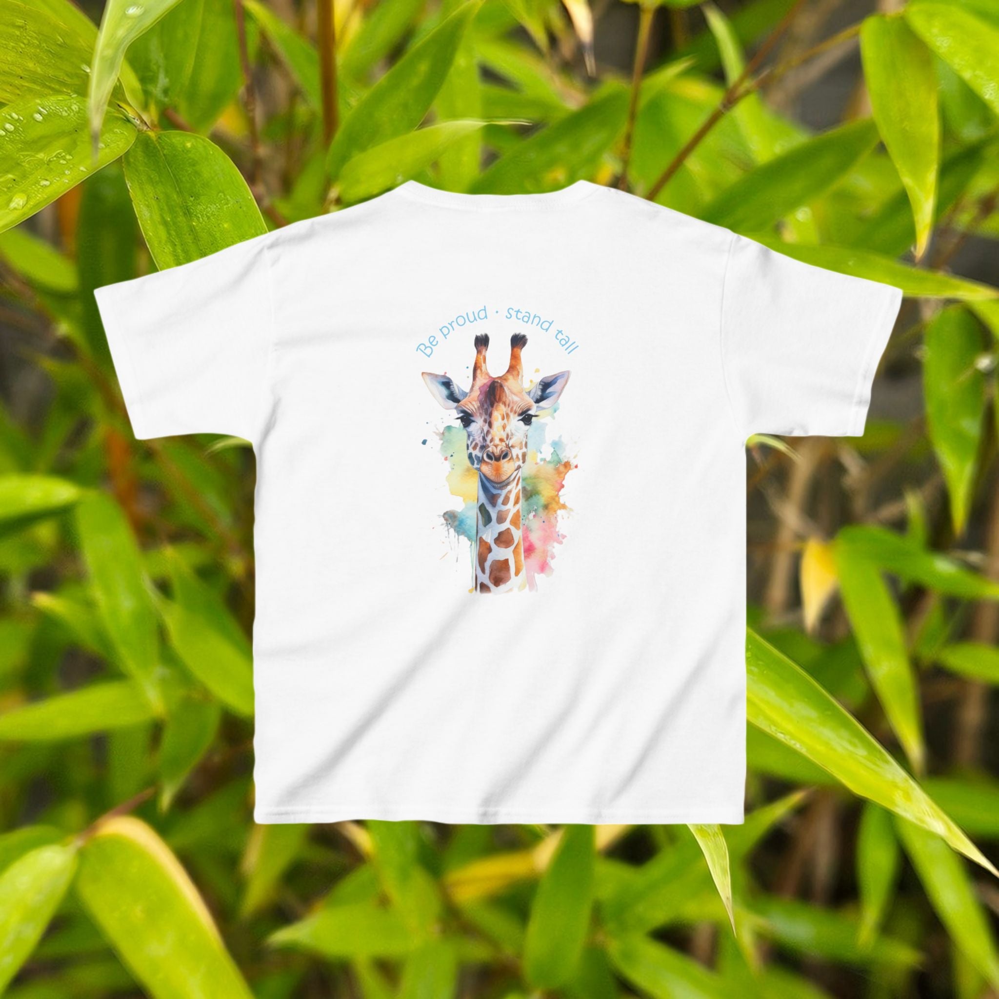 A colorful giraffe design with a motivational message, perfect for inspiring little ones to be proud of who they are. This tee is made with soft, midweight cotton, making it a comfortable choice for any season. The classic fit and crew neckline offer timeless style that is ideal for daily wear. Kids will love the fun design (front and back) while parents will appreciate the ethical and sustainable production.